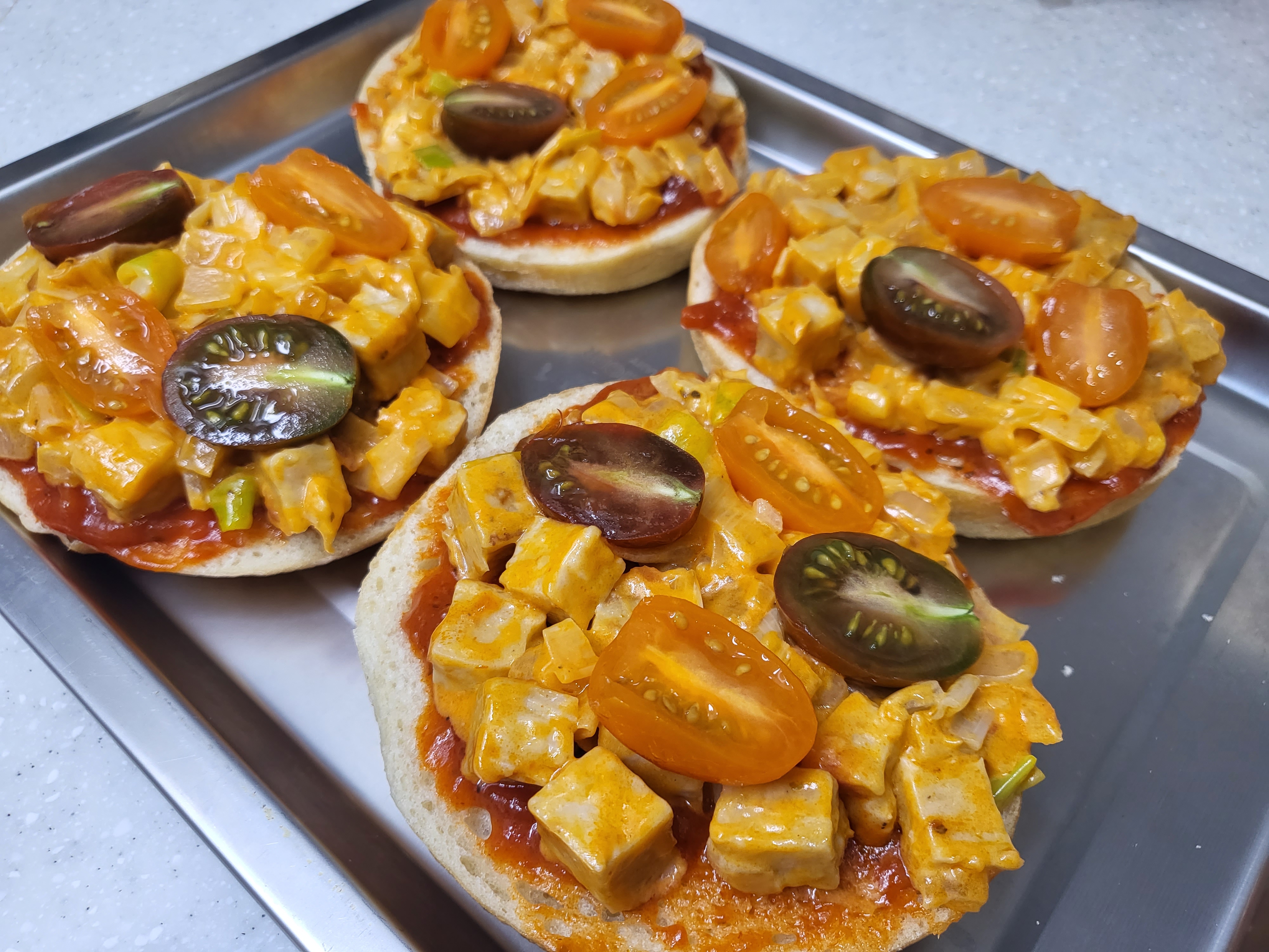 베이글, 토마토소스, 치즈, 대파, 양파, 토마토, 닭가슴살, 버터