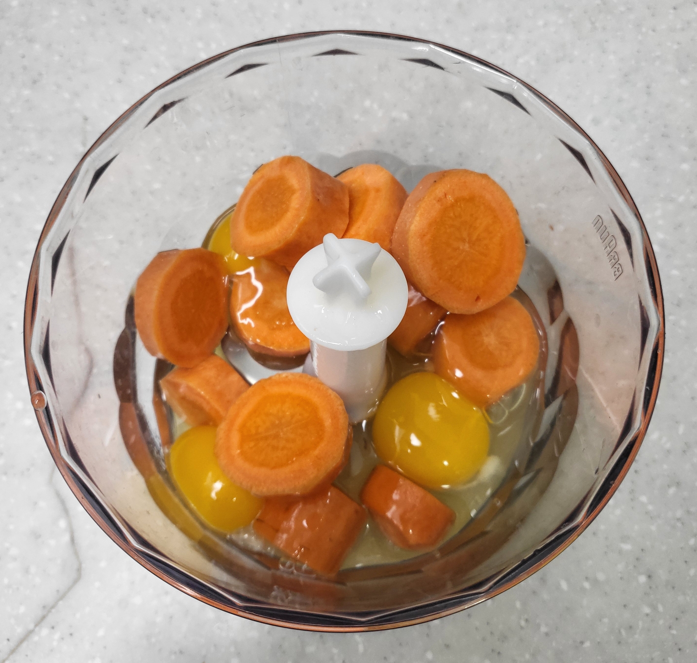 1. 당근, 계란 3개, 아몬드 한 줌, 버터 1큰술, 유자청 넣고 믹서기에 갈아줍니다.
