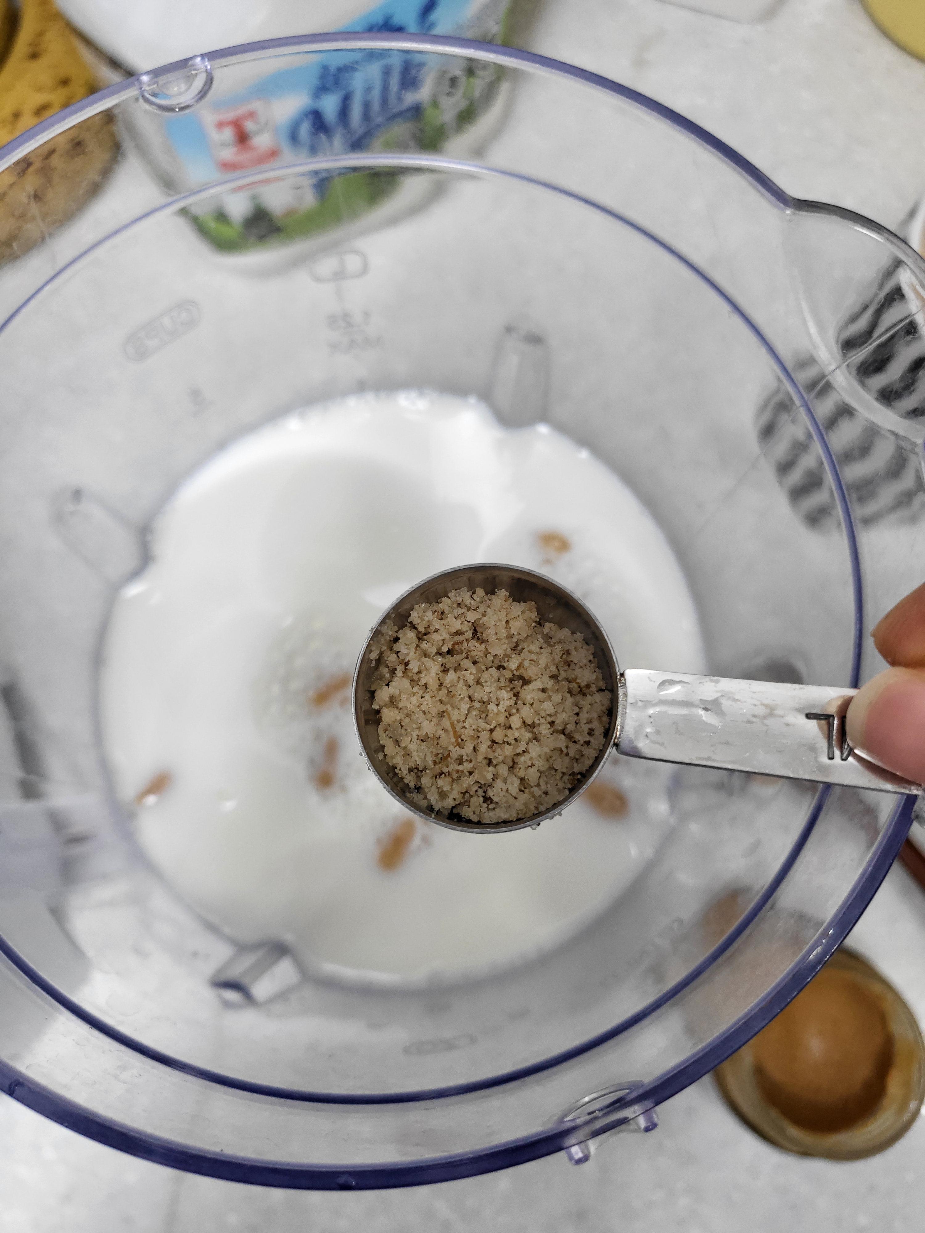 2. 땅콩버터 1큰술, 소금 1스푼과 우유 넣고 갈아주세요.