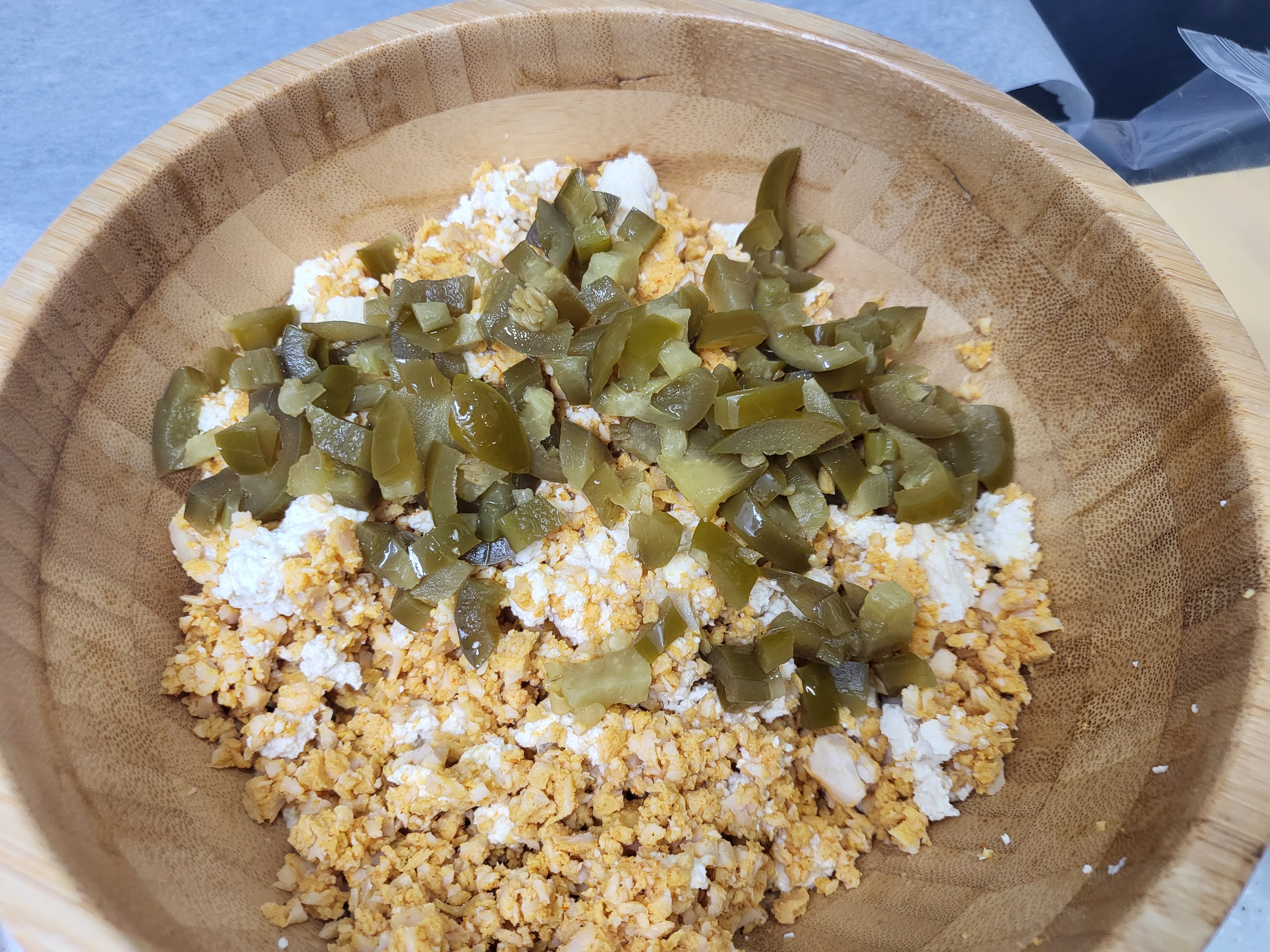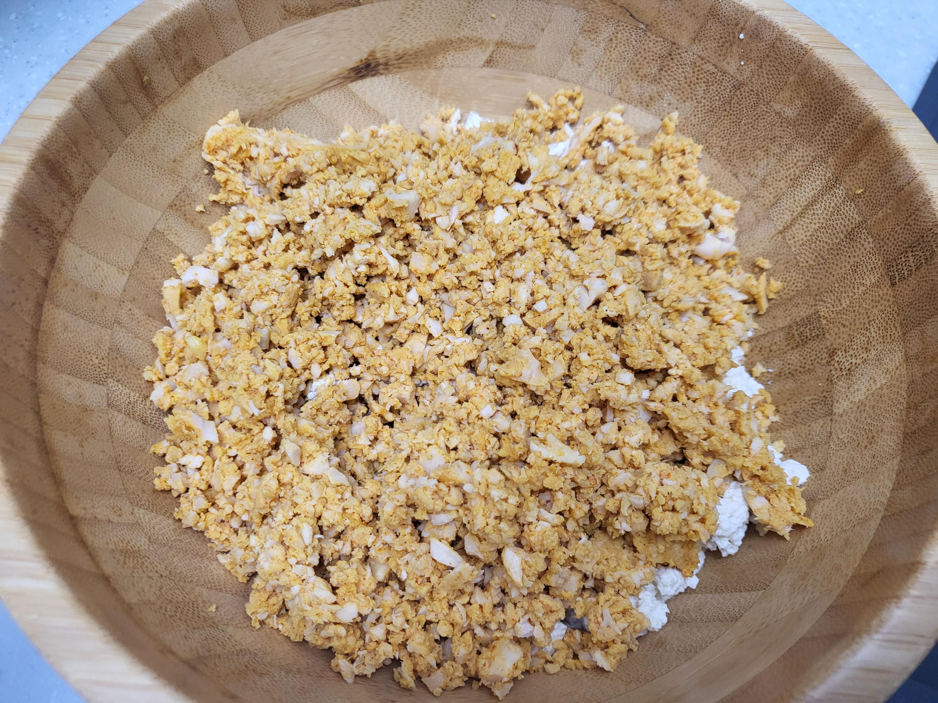 1. 두부는 으깨어 준비해주고 닭가슴살 다진 것과 함께 섞어주세요. 여기에 매콤한 할라피뇨 넣어줘도 좋아요!