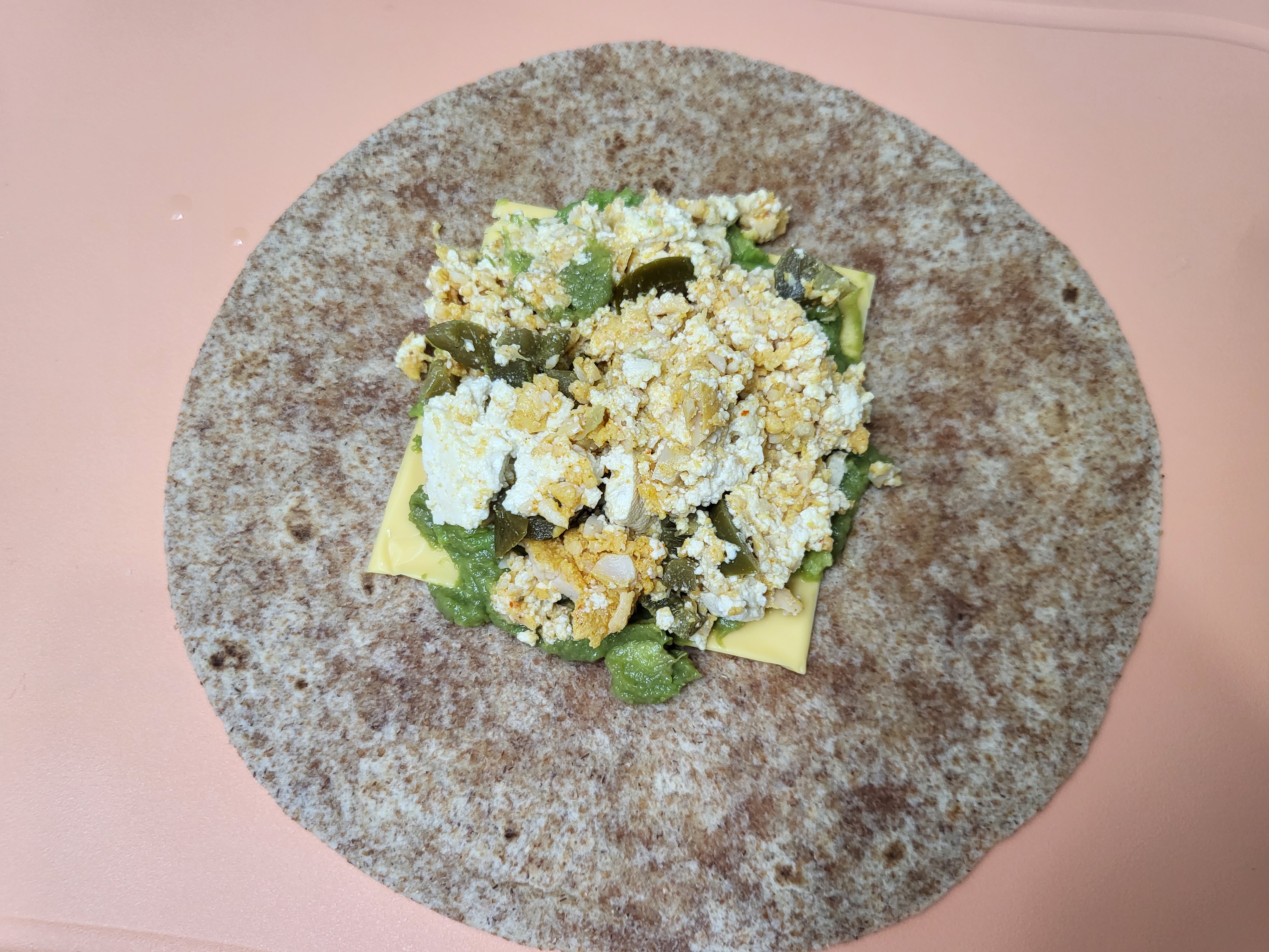 2. 통밀또띠아 위로 슬라이스치즈 > 과카몰리 > 두부&닭가슴살 > 모짜렐라치즈 올려주세요.